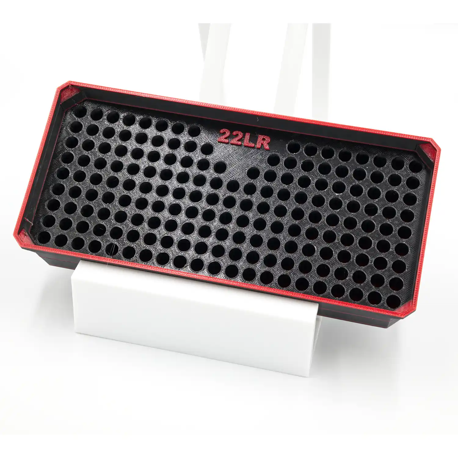 Holds 180 Rounds of 22LR. Black with Red Accent.