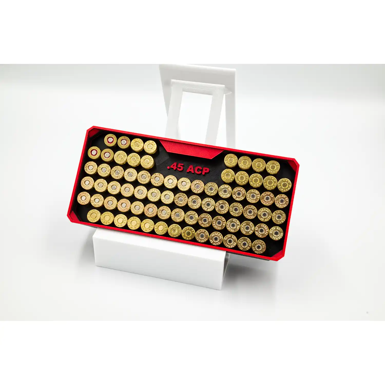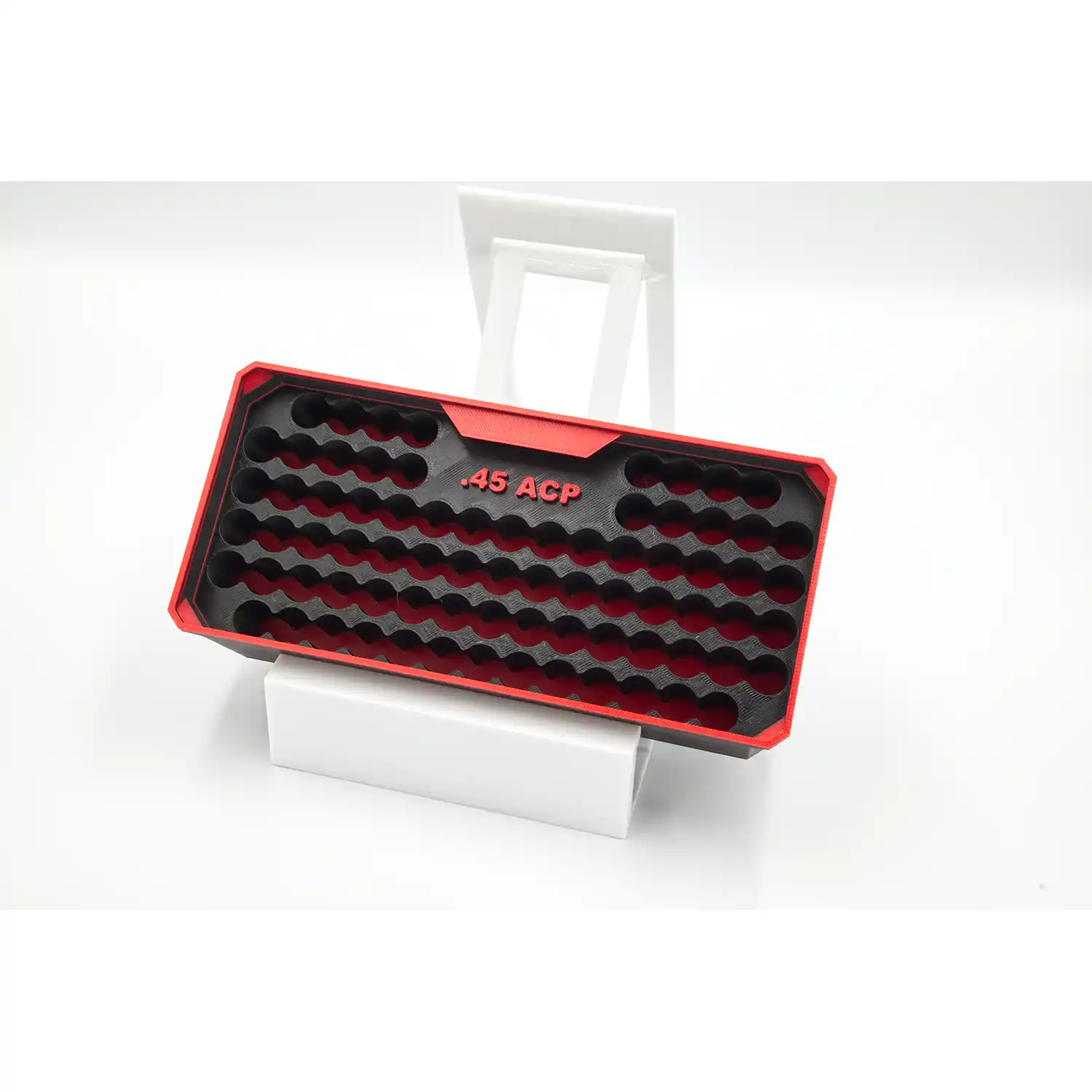 Lift the lid and step into a world of refined order. Inside, a meticulously sculpted interior awaits—engineered to showcase your ammunition with elegance and absolute efficiency. Designed to cradle each round with purpose, the 45 ACP Rectangle carries up to 140 rounds in a layout that’s as visually striking as it is functional. Every channel, contour, and recess is intentionally shaped to hold your ammo firmly in place, ensuring fast access, zero wasted space, and professional-grade organization you can feel the moment you open it.