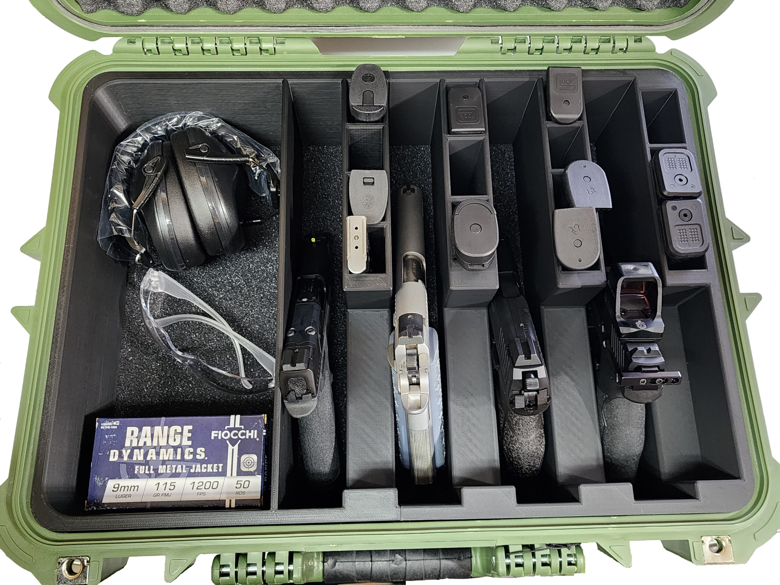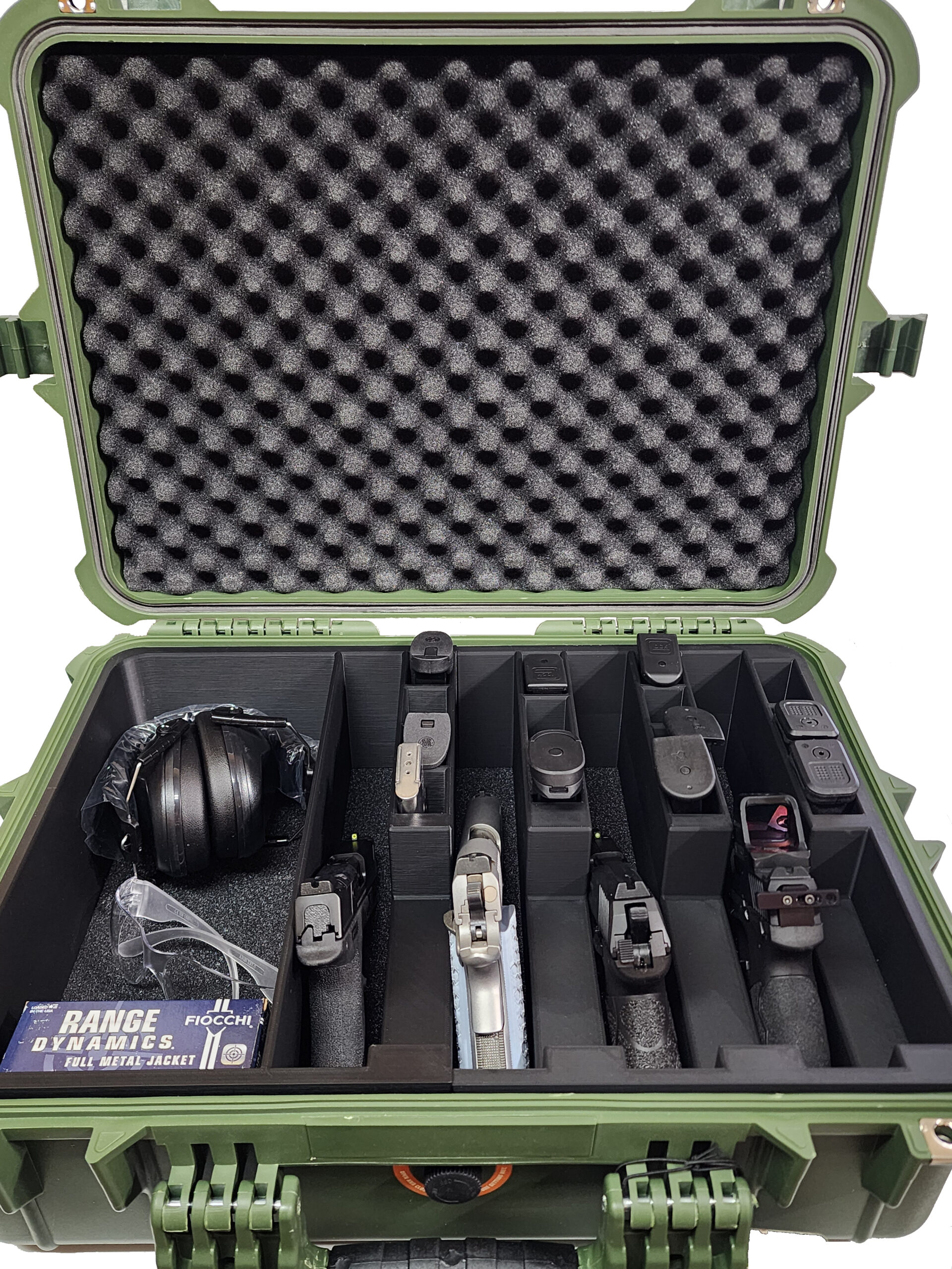 Open the lid and you’re greeted by a beautifully engineered interior—meticulous, intentional, and crafted for shooters who demand more than simple storage. Inside, up to four standard firearms or long-barrel revolvers rest in precision-cut recesses, joined by space for fourteen magazines and a dedicated open pocket for ammunition boxes, eye protection, and ear protection. Every contour and curve is sculpted with purpose, delivering fast access, zero wasted space, and a presentation that feels as professional as it is secure. To ensure total stability during transport, the case features high-density foam padding on both the bottom and the underside of the lid. When closed, the foam compresses gently around your firearms and magazines, locking everything firmly in place and preventing even the slightest movement. Your gear stays secure, silent, and protected—no rattling, no shifting, no surprises.
